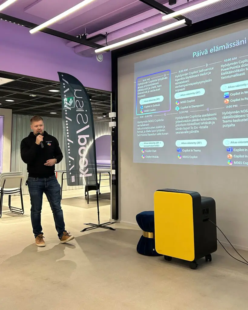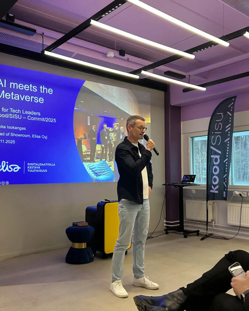 Jukka Isokangas from Elisa walked the audience through Elisa’s AI Showroom and Metaverse Lab, showcasing how automation, AI and immersive technologies are already part of their daily workflows. Pasi Ruotsalainen from Microsoft continued by highlighting how Finnish companies are taking steps toward responsible and ambitious use of AI, grounded in real business outcomes. Finally, Olli-Pekka Inget from Heppu AI shared a case study illustrating the essential connection between technology and sales, demonstrating why even the most advanced solutions need a strong commercial understanding to deliver value.